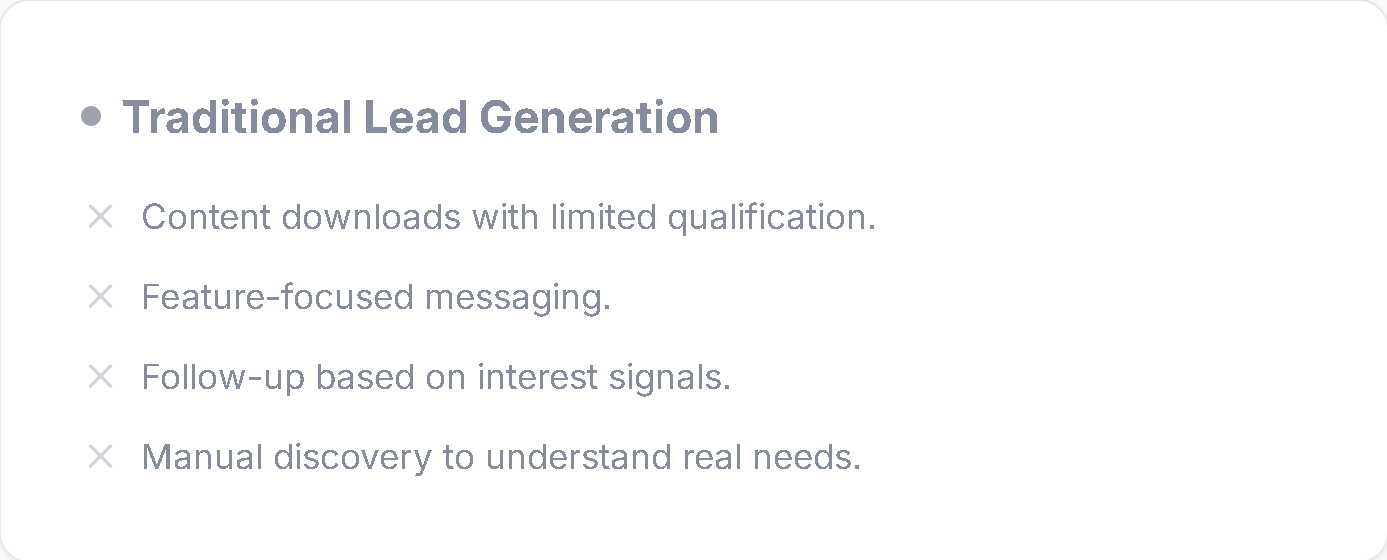 Traditional lead generation focuses on attention and activity. Opportunity Creation focuses on capability gaps and business impact.