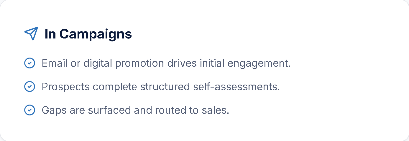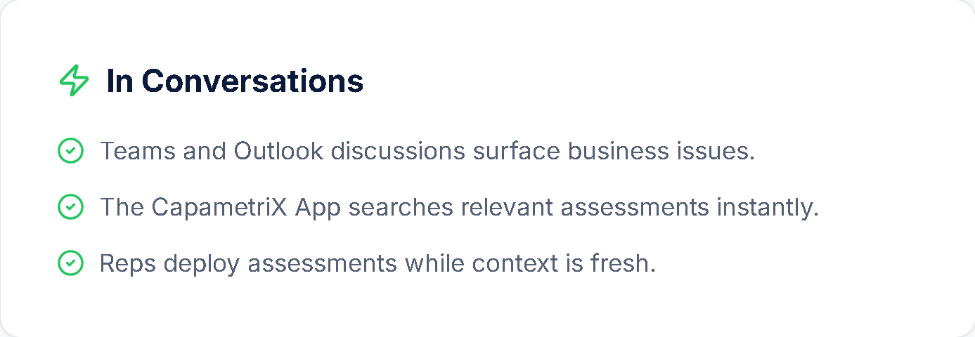 The CapametriX Agent enables teams to deploy relevant assessments and supporting assets directly inside Microsoft Teams and Outlook conversations. Instead of relying solely on outbound campaigns, reps can share structured assessments at the exact moment a business issue is discussed.